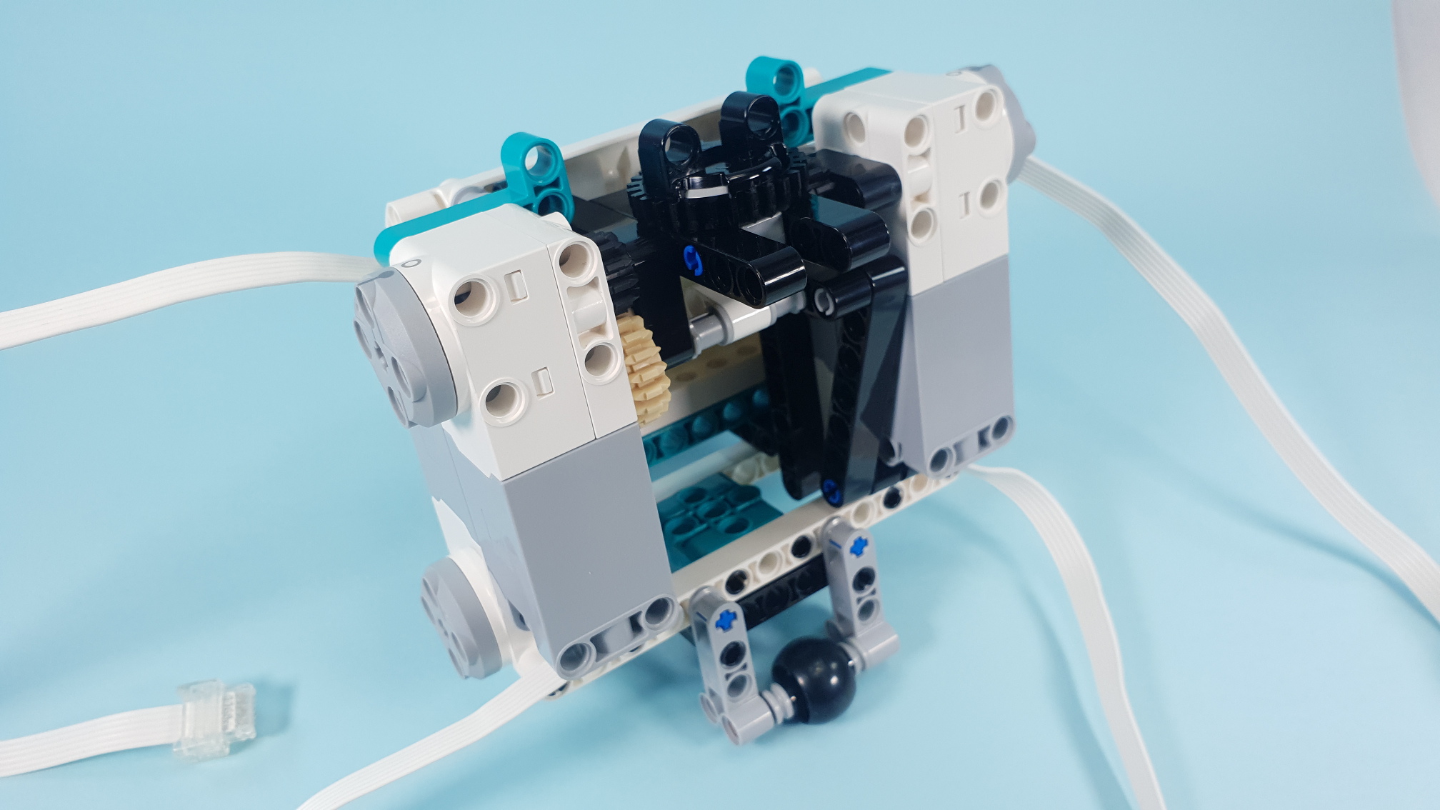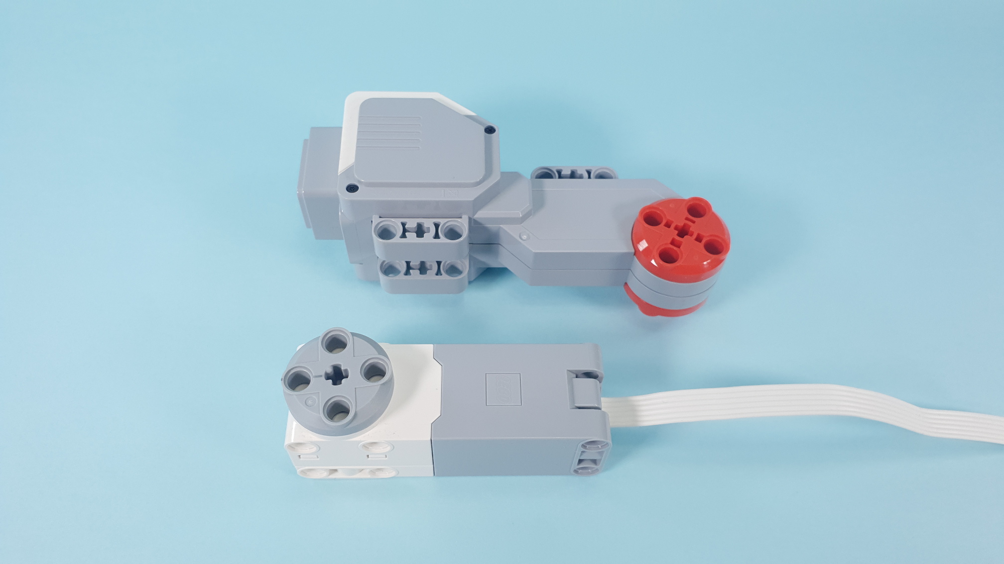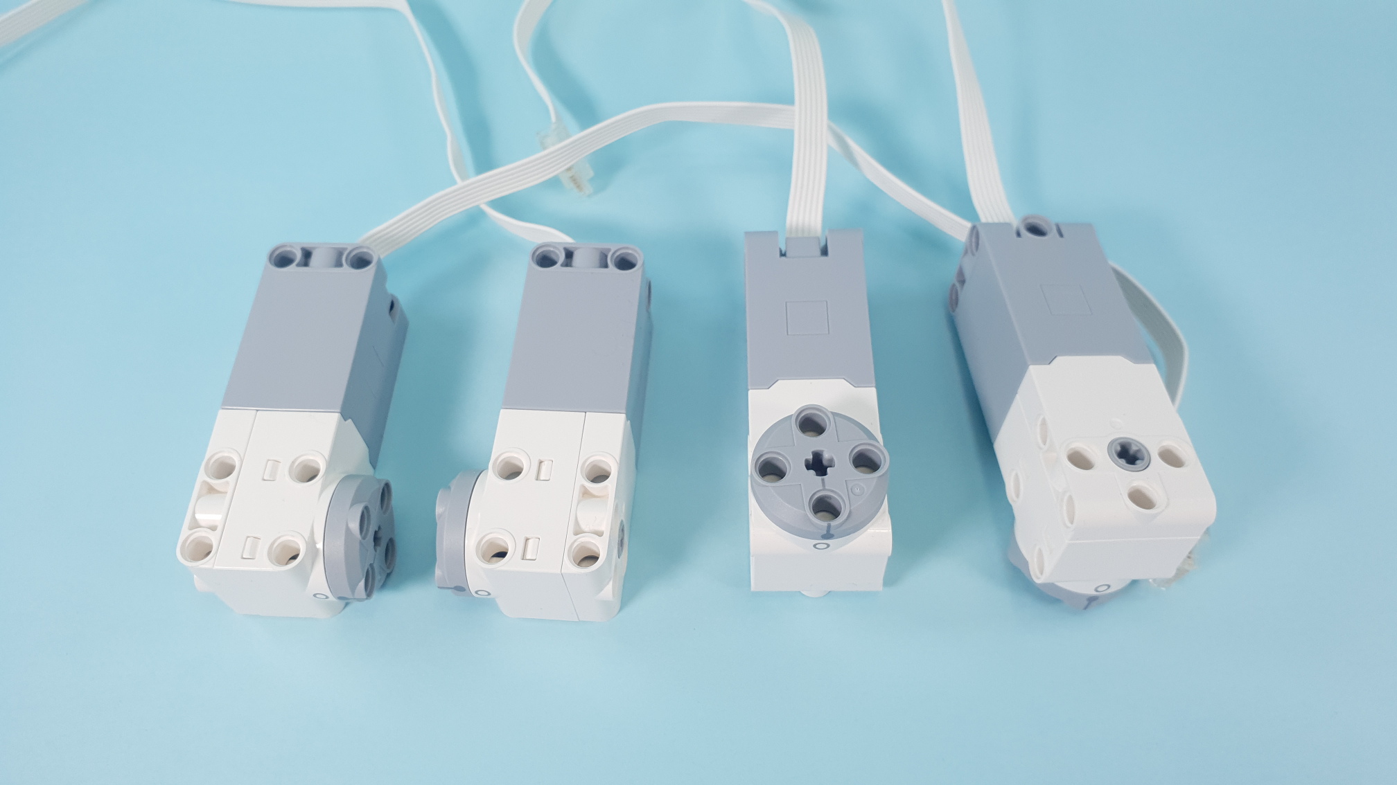 4 özdeş orta motor, bir ışık/renk sensörü ve ultrasonik kullandığını varsaydığım bir mesafe sensörü ile birlikte gelir. EV3’ün aksine, kabloların tümü cihazlara entegre edilmiştir. Bunun iyi bir şey mi yoksa kötü bir şey mi olduğundan henüz emin değilim.
