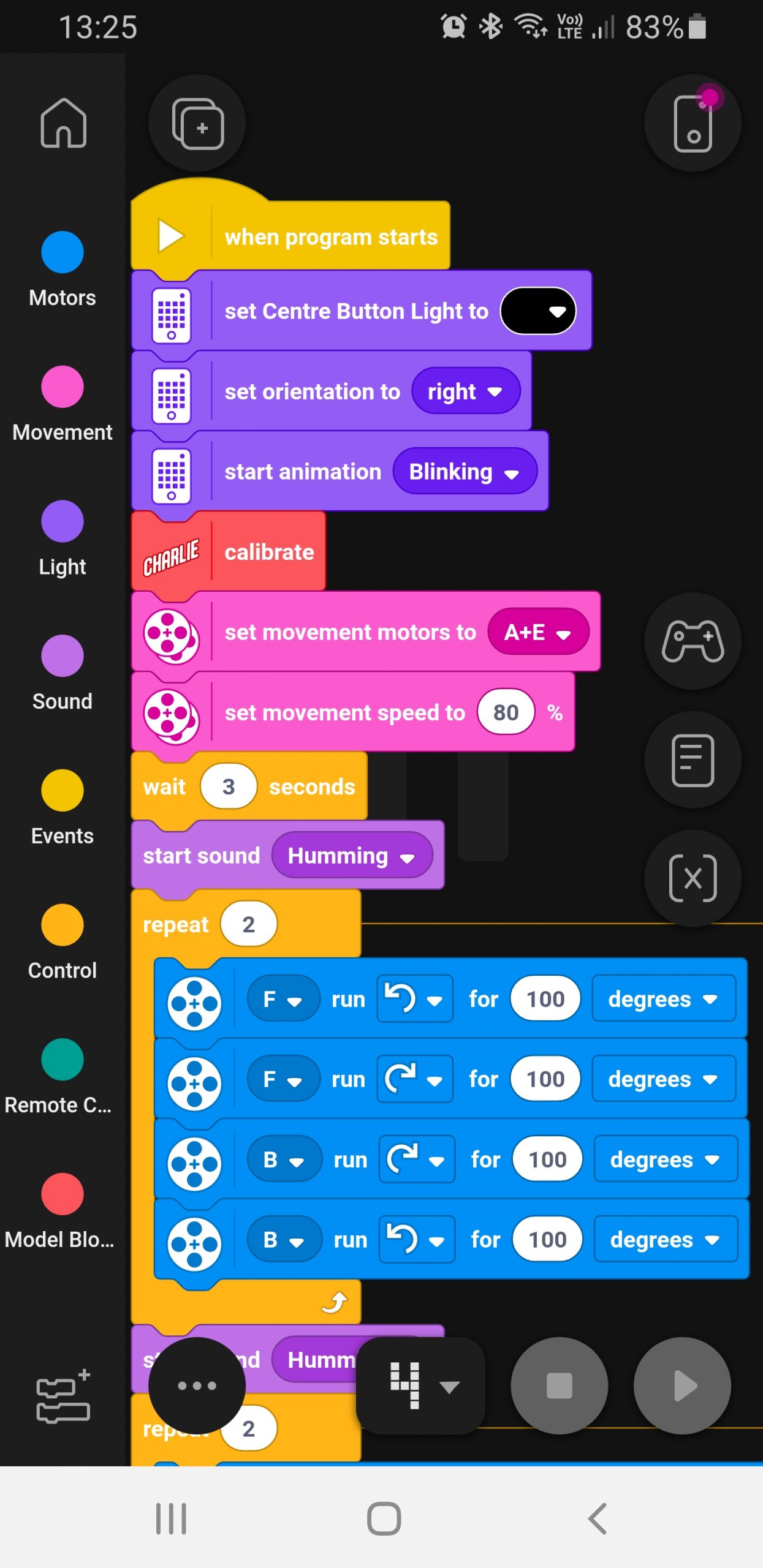 Program, Scratch gibi uygulamalarda daha önce gördüğümüze çok benziyor. Kontrol blokları renk kodludur ve renkler, giriş/çıkış bağlantı noktası numaraları, sabitleri belirtmek veya kaydedilmiş animasyonları/sesleri vb. seçmek için açılır seçeneklere sahiptir. Bu şeyin doğru şekilde kullanılması için gerçekten en azından bir tablete ihtiyacı vardır (ideal olarak benim ikili ekran masaüstü, grrrr).