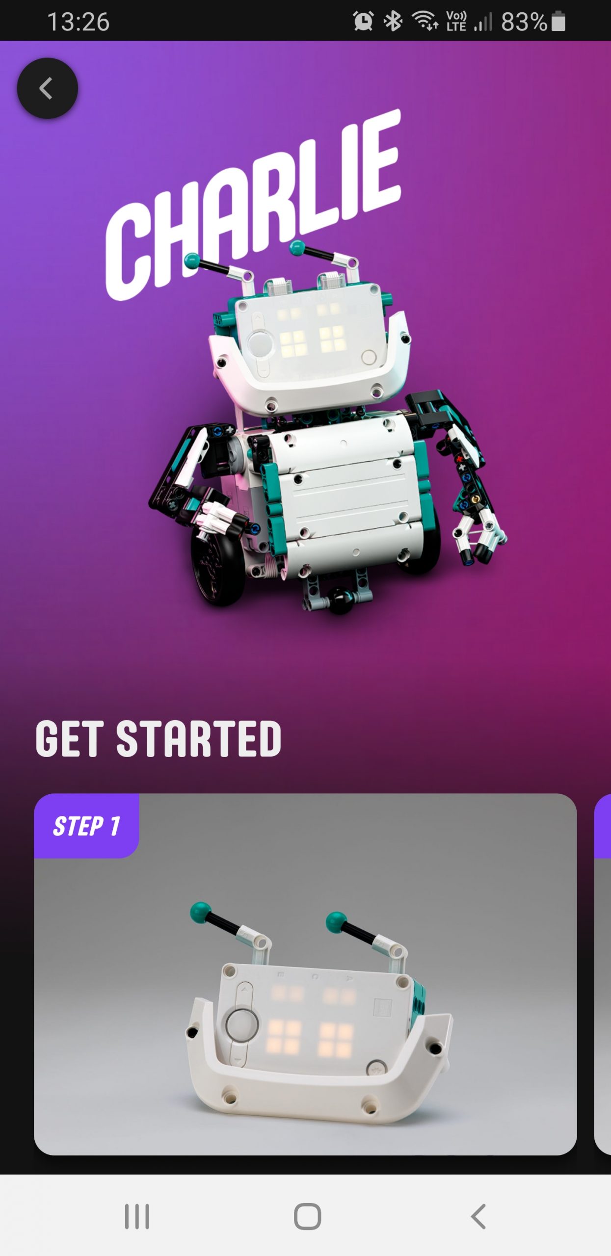 Uygulamayı başlatırken, oluşturabileceğiniz beş robotu görüntüler. EV3 için, sonunda bariz ana olana kadar inşa edilen bir dizi küçük robot vardı. Burada, aşağı yukarı hepsi eşit gibi görünüyor. Ben de başlamak için Charlie’yi seçtim.