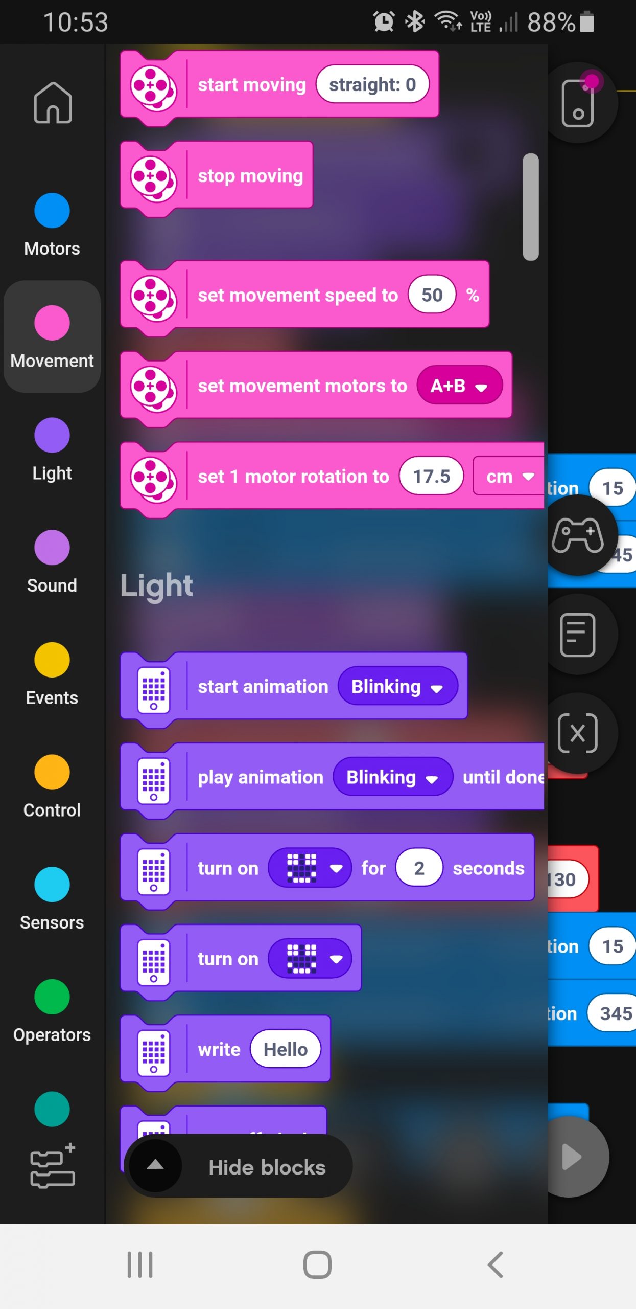 Motorlar konum (derece), hız (0-100), güç (%) ve sayılan dereceler için giriş değerleri sağlar. Tüm bu değerleri kontrol edebiliyorsunuz ve sizin için işleri kolaylaştıran bloklar var. Hangi motorların hareketi kontrol ettiğini belirtebilir ve ardından sizin için kullanılacak doğru bağlantı noktalarını/ayarları bulan “10 cm ileri git” ve “X konumuna en kısa yolu dön” gibi bloklar kullanabilirsiniz.